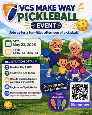Our afternoon festivities include a fun and engaging pickleball event where students can team up with their grandparent, parent, or a special friend. Join us on May 22, 2026, for the VCS Make Way Pickleball Event—an exciting time of friendly competition, community connection, and plenty of fun, complete with treats and prizes, all for just $10 per team! We have spots for only 80 teams! Sign up today